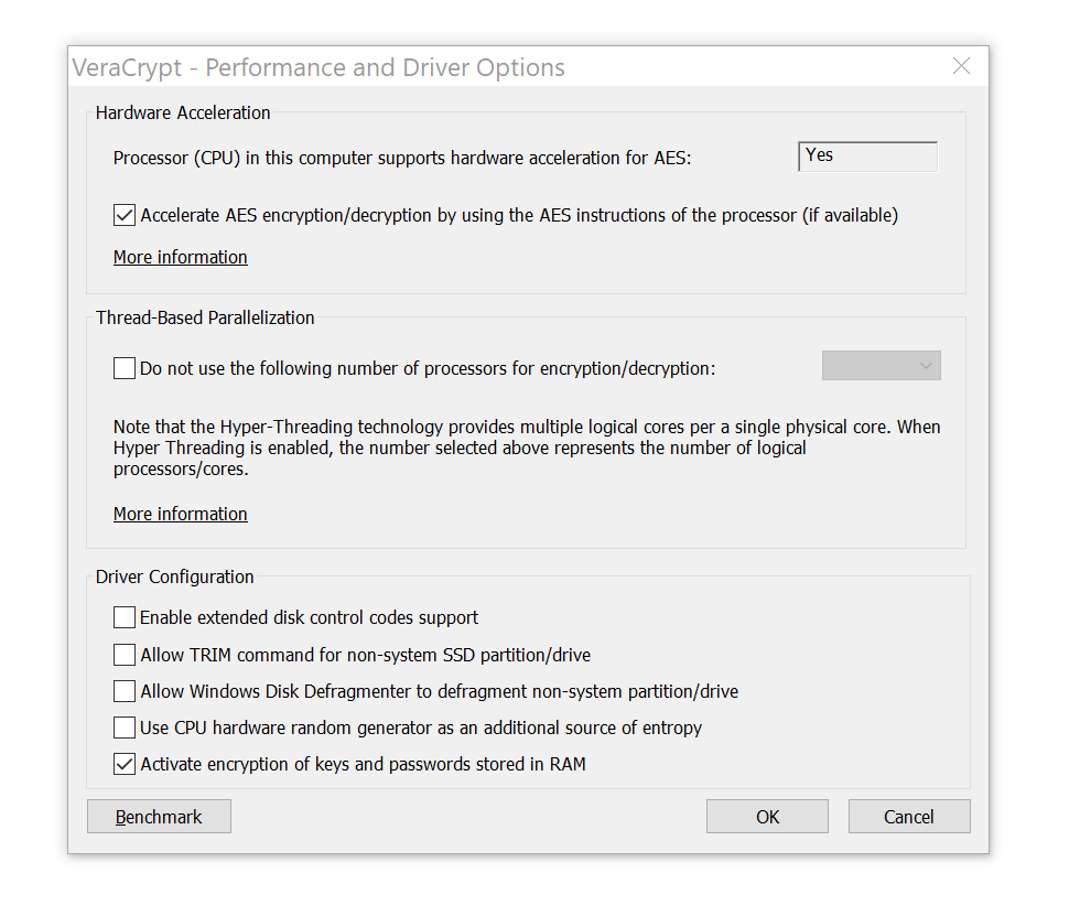 Можно ли защититься от подобных атак? Полноценная защита от извлечения ключей шифрования из оперативной памяти компьютера достаточно сложна, а на обычном десктопе может и вовсе оказаться невозможной (противостоять криогенной атаке вообще достаточно тяжело, но и вероятность ее применения исчезающе мала). В то же время вы можете включить в настройках VeraCrypt недавно появившуюся возможность шифрования ключей шифрования в оперативной памяти компьютера.