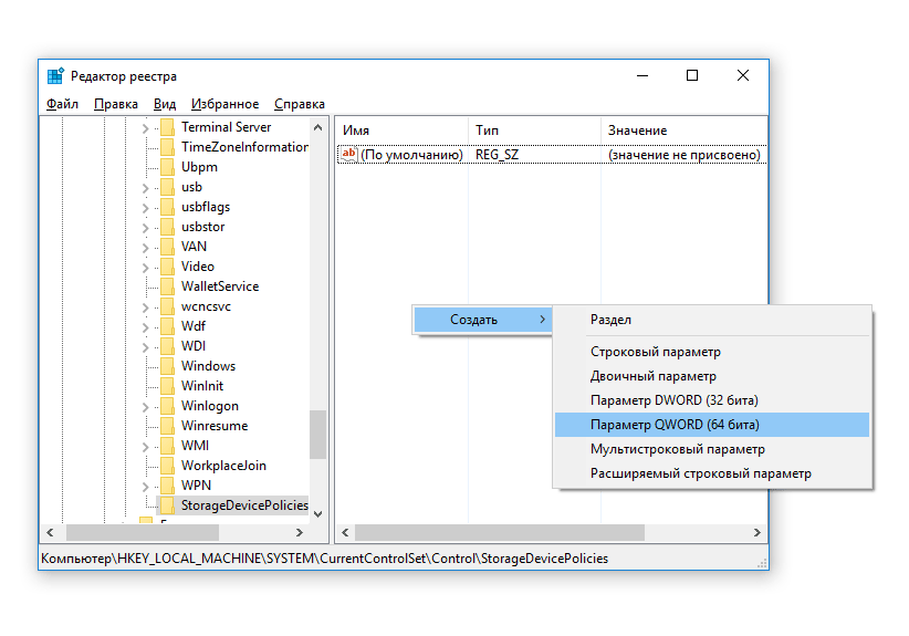В разделе StorageDevicePolicies вам необходимо создать ключ реестра «Параметр QWORD (64 бита)» с именем WriteProtect и дать ему значение 0.
