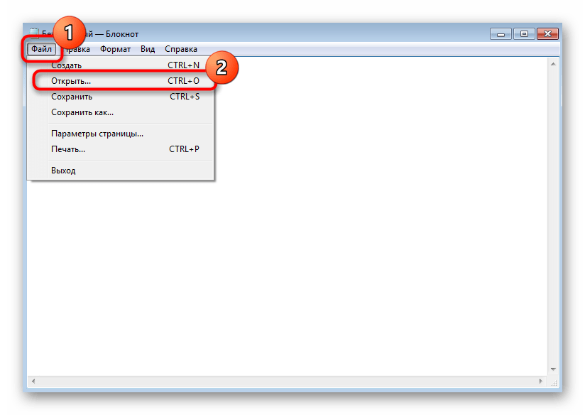 В окне Блокнота разверните меню «Файл», где выберите пункт «Открыть». Вызвать эту опцию можно и через сочетание клавиш Ctrl + O.
