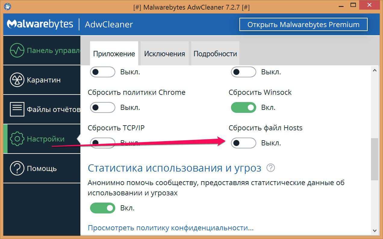 Коммерческий профессиональный проект, предоставляет комплекс мер по защите системы. Существует несколько разновидностей данного продукта, и для работы с hosts вам понадобится Malwarebytes AdwCleaner версии 7+, скачать его можно с официально сайта компании. Данная версия годится для одноразового сканирования дисков компьютера, и проведения других процедур обслуживания и оптимизации, в том числе сбрасывания файла хостс. Для этого откройте Настройки в программе, и на вкладке Приложение, найдите переключатель «Сбросить файл Hosts».