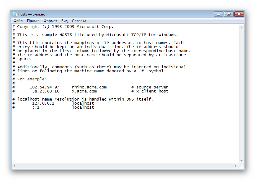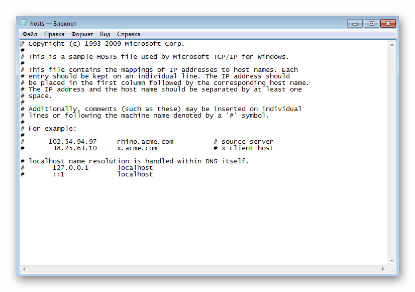 Последний шаг — убрать все лишние строки из файла hosts, либо просто вставить оригинальное его содержание в файл, которое можно скопировать, например, отсюда (а заодно и посмотреть, какие строки лишние).