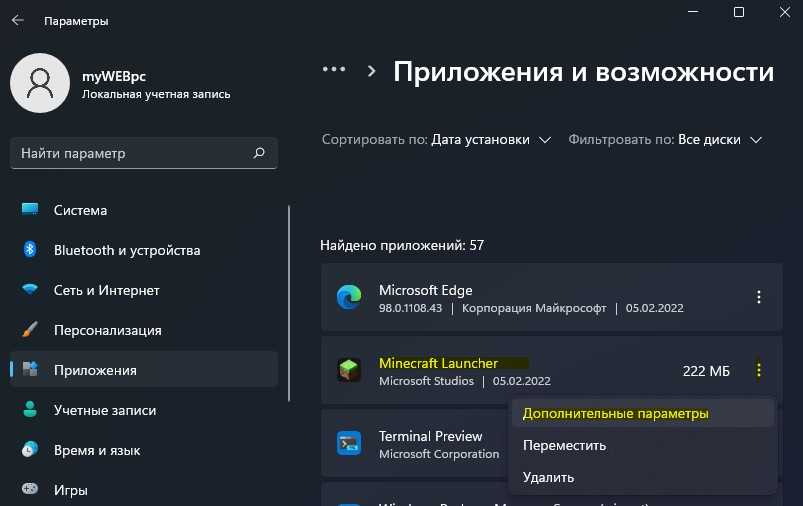 Откройте в параметрах Windows 11/10 пункт Приложения и возможности, найдите Minecraft Launcher и саму игру, после чего нажмите на Дополнительные параметры.