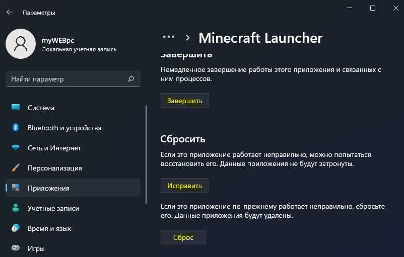 В новом окне нажмите по порядку Завершить, Исправить, Сброс. Затем откройте Microsoft Store и введите в поиске Minecraft, откройте саму игру или Launcher и нажмите на кнопку Получить. Если Получить нет, то просто нажмите Играть.