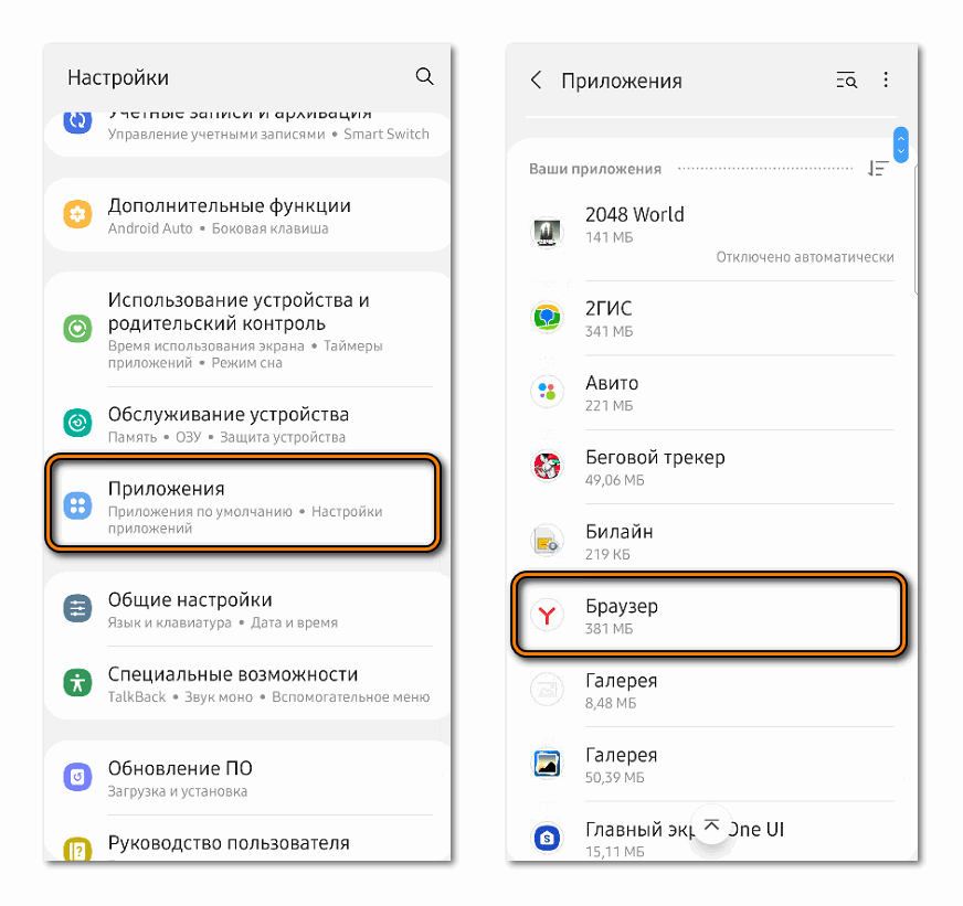 - В списке коснитесь опции «Браузер», найдите Яндекс.Браузер и нажмите на него.