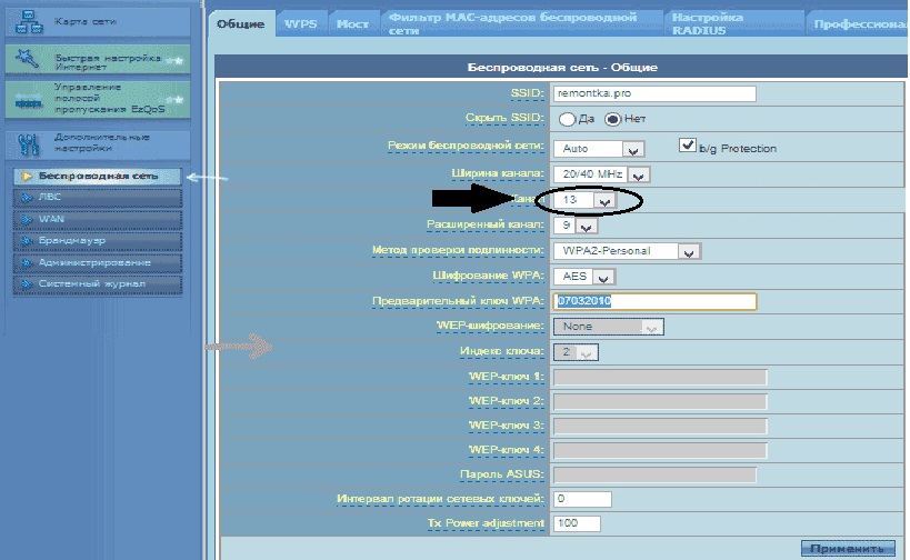 ASUS. Пользователям этих маршрутизаторов необходимо войти в настроечный раздел, а там в категорию Беспроводная сеть (колонка Дополнительные настройки). В центральной части отыщите нужную графу и внесите изменения в номер channel. Далее жмите на кнопку применить.