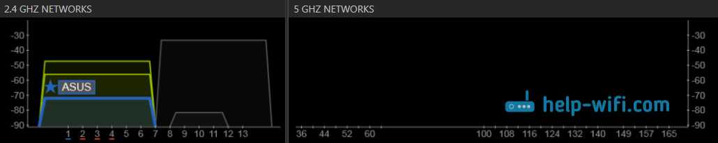 Справа нашего графика есть поле и для изображения сигнала роутеров на 5 ГГц, но оно пустое, так как данная диагностика доступна лишь в платной версии используемой программы. Даная программа актуальна для компьютеров, планшетов и ноутбуков. Если настраивать Wi-Fi на телефоне, к примеру, на Андроиде, то нужно использовать специальные приложения-программы.