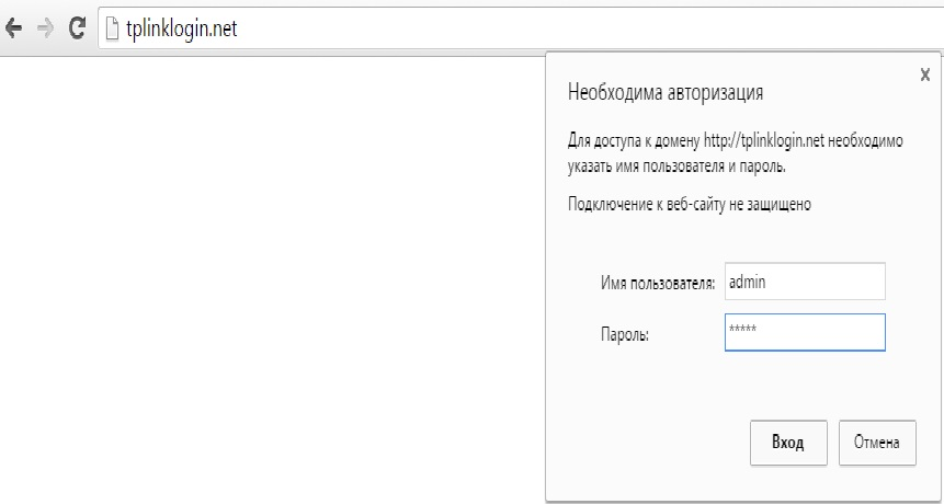 - Перед вами откроется окно, в котором система запросит логин и пароль для входа в веб-интерфейс роутера. Если они уже были изменены, введите персональные данные. По умолчанию для моделей ТП-Линк логин и пароль будут admin для обоих полей.