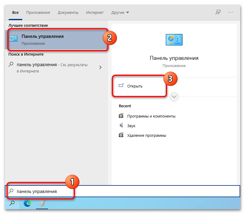 - Вызовите «Панель управления». Проще всего сделать это посредством «Поиска»: откройте его, напечатайте название оснастки, затем кликните по результату.