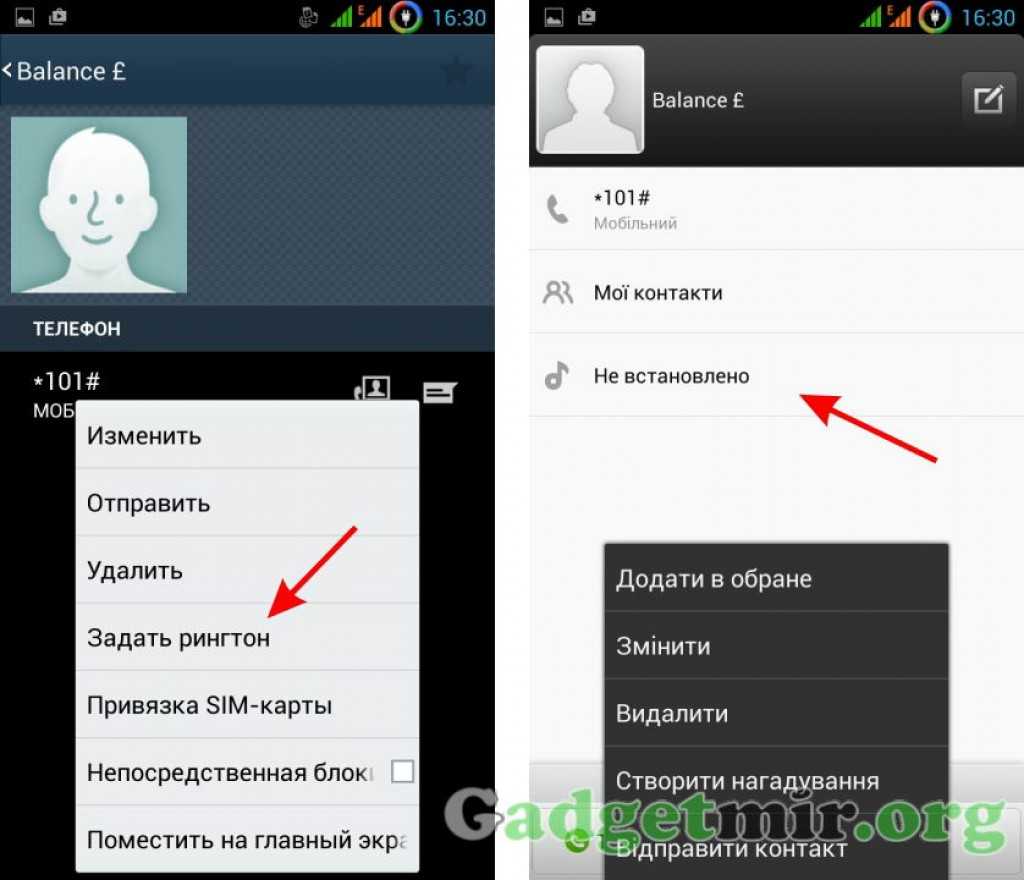 - нажимаем меню и выбираем пункт «задать рингтон». На разных устройствах , этот пункт может по-разному называться. К стати он может быть размещен ниже под данными контакта.