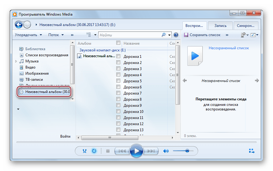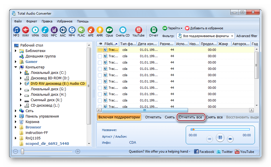 - После выбора в Проводнике программы оптического дисковода с СD диском отображается список дорожек. Для выделения всех песен нажимаем на «Отметить все».