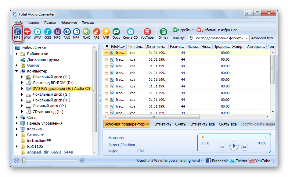 Если открыть CD в «Проводнике», можно заметить, что диск состоит из файлов в формате CDA. На первый взгляд может показаться, что это обычный аудиоформат, но на самом деле это метаданные трека, в которых нет музыкальной составляющей, потому конвертировать сами по себе CDA в MP3 лишено смысла. Собственно, аудиотреки находятся в зашифрованном виде, потому преобразование CD в MP3 подразумевает собой как извлечение самих треков, так и прибавление к ним CDA-метаданных.