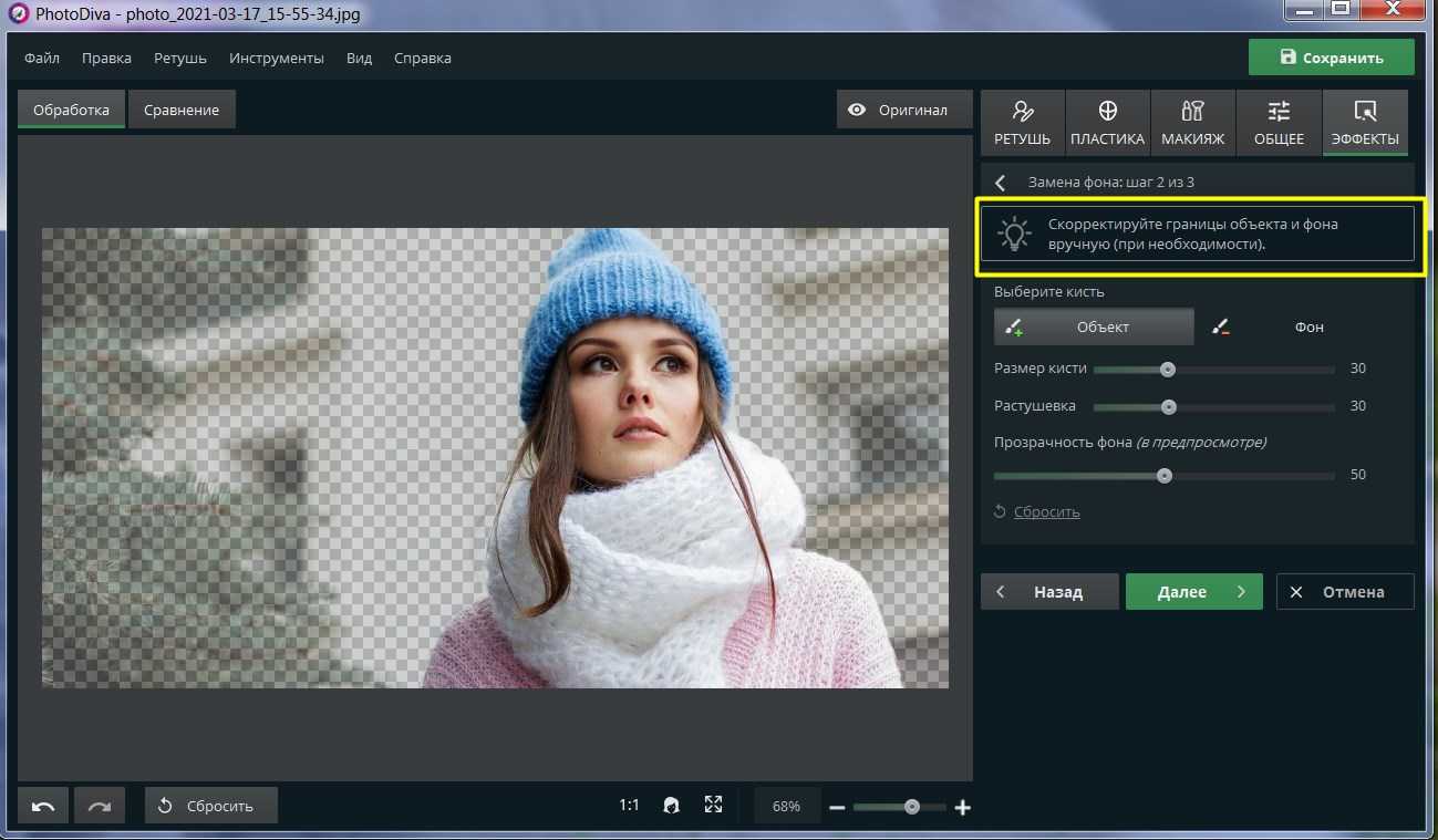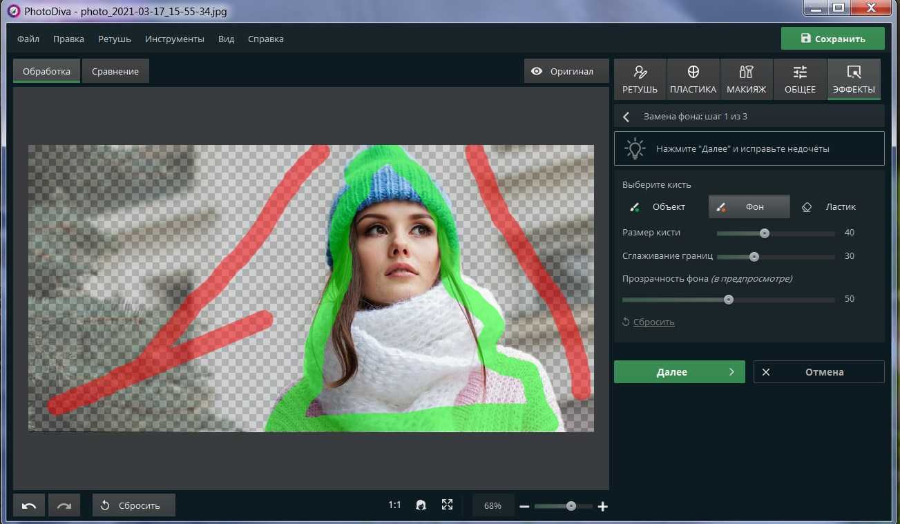 Если обводка была проведена некорректно, редактор предложит вам уточнить границы. Воспользуйтесь зеленой кистью, если случайно задели части объекта. Просто прорисуйте области, которые хотите вернуть. То же самое сделайте с фоном, переключившись на красную кисть, и закрасьте на этот раз удаляемые участки. Когда результат вас удовлетворит, вновь нажмите «Далее».