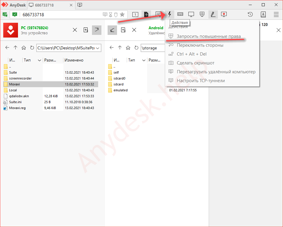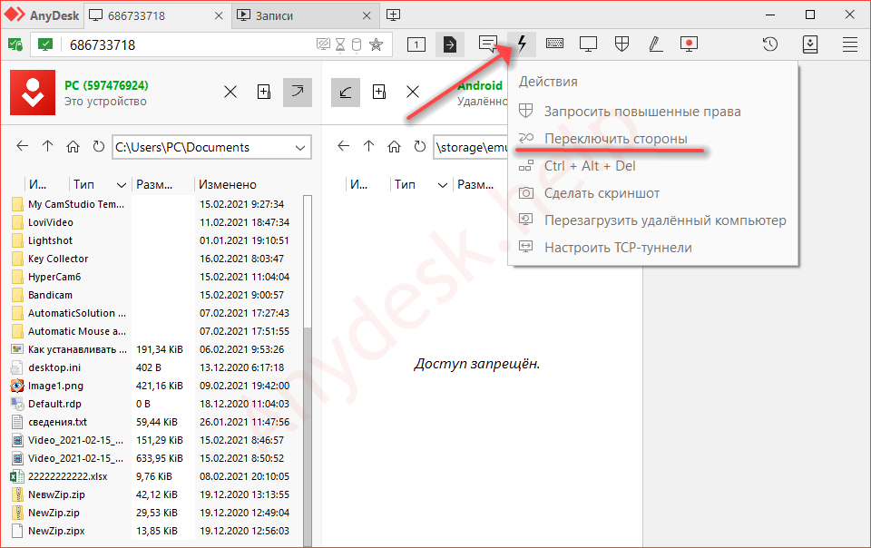 При работе в AnyDesk подключаемый компьютер называется доминантным (оператор), тот, к которому подключаются – клиентским, подчинённым. Приложение позволяет в два клика обменять их ролями (правами) без разрыва соединения. Откройте меню действий и выберите «Переключить стороны».