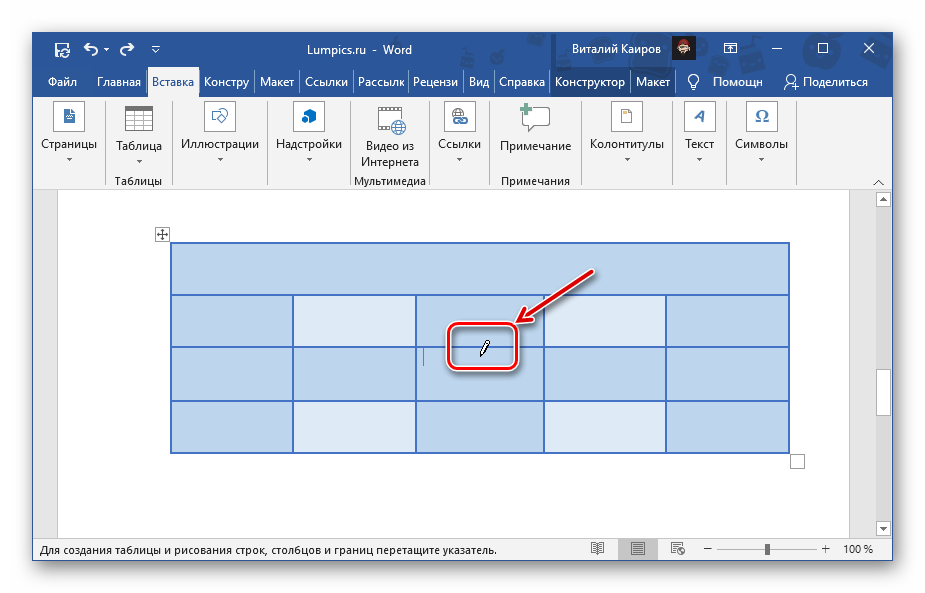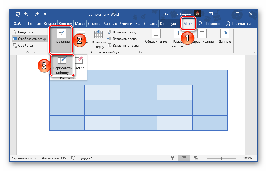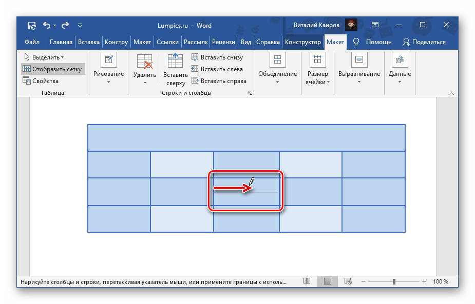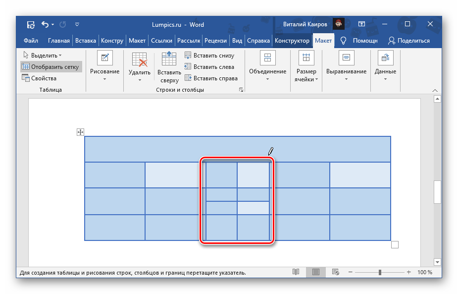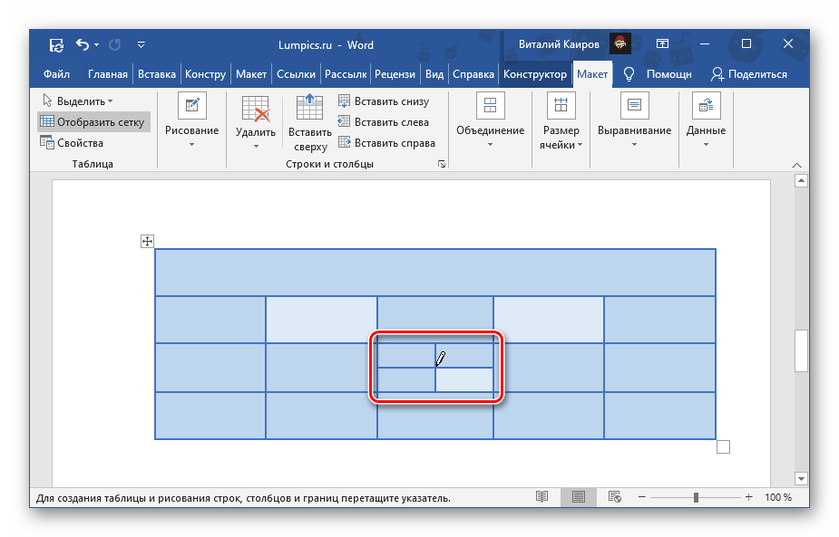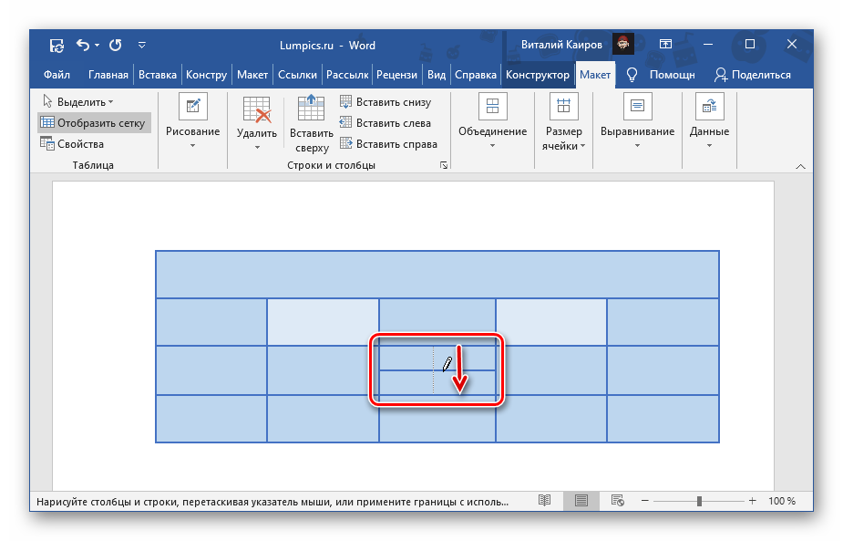 Существует еще один метод разделения ячеек в таблице Ворд, который, в отличие от двух предыдущих, позволяет это сделать не только строго симметрично, а еще и произвольно, вручную нарисовав линию, которая поделит элемент на столбцы и/или строки.