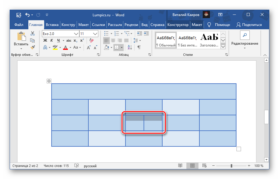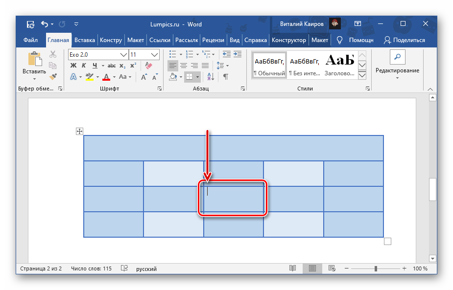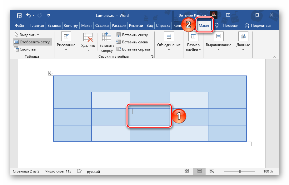 - Кликните левой кнопкой мышки (ЛКМ) по той ячейке, которую требуется разбить, и перейдите в показанную на изображении ниже вкладку «Макет».