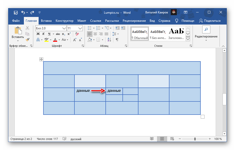 - Используя «Ctrl+V», вставляем Таблицу 2 в указанное место.
