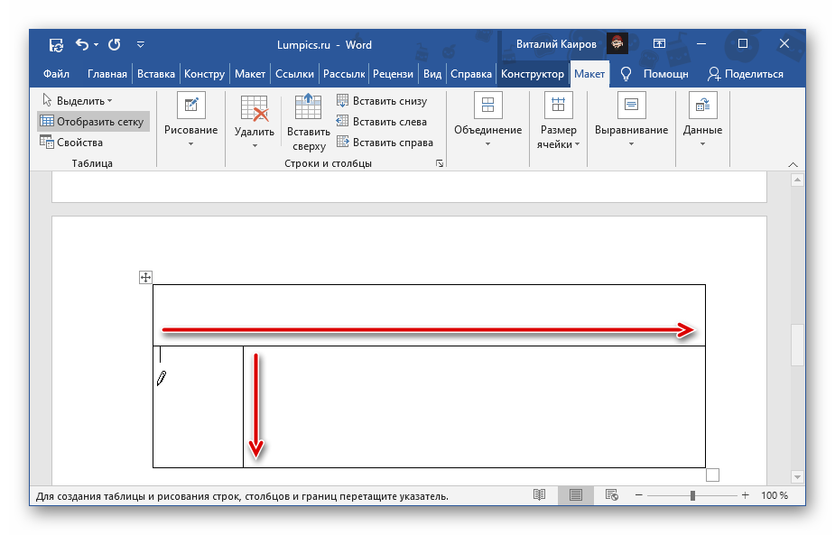 Для этого достаточно провести в ней вертикальную или горизонтальную черту (обязательно делать это строго от границы до границы и максимально ровно), в зависимости от того, требуется ли сделать строки или столбцы.