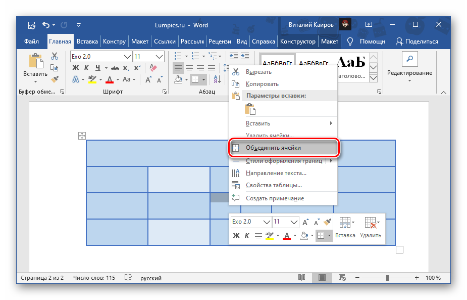 Для объединения нескольких ячеек таблицы нужно выделить их и нажать кнопку Объединить ячейки . Эту же команду можно выбрать в меню Таблица или в контекстном меню выделенных ячеек. Ячейки можно объединять как в горизонтальном, так и в вертикальном направлении.