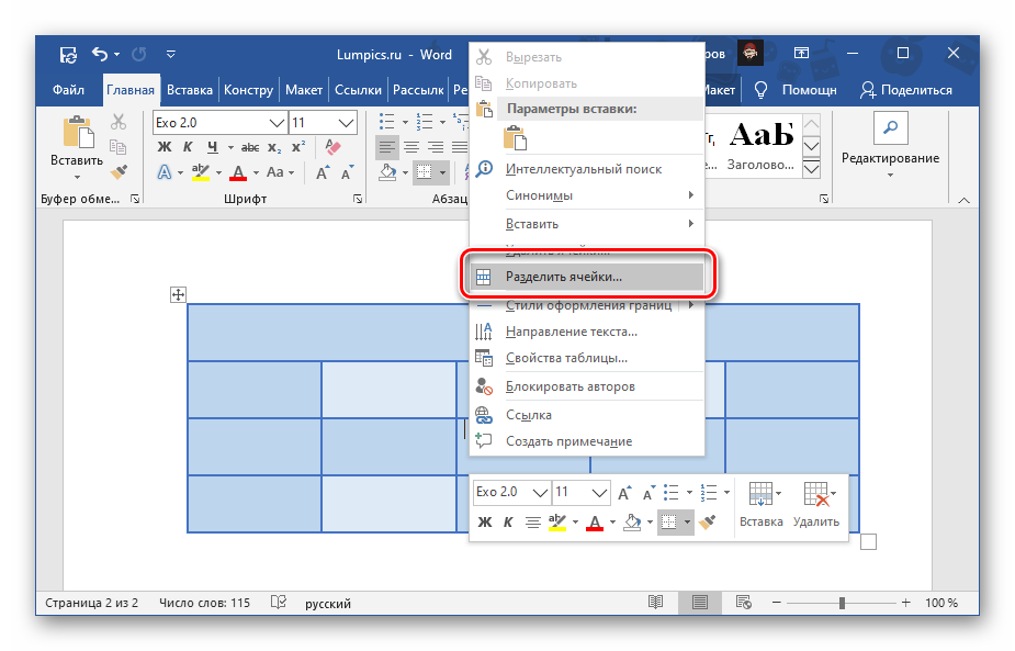 Наиболее простым способом разделения ячеек в таблице Ворд является обращение к контекстному меню, вызываемом на соответствующем элементе.