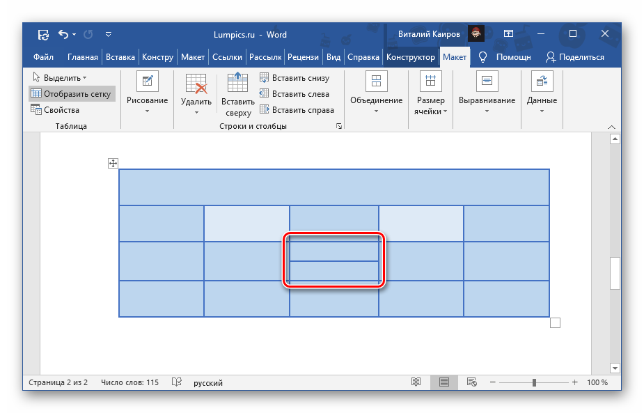 Сразу после создания таблицы и/или ее выделения на панели инструментов Ворд появляется группа «Работа с таблицами», состоящая из двух вкладок – «Конструктор» и «Макет». Обратившись к последней, можно решить озвученную в заголовке статьи задачу, главное – не путайте ее с вкладкой, которая изначально представлена в панели инструментов.
