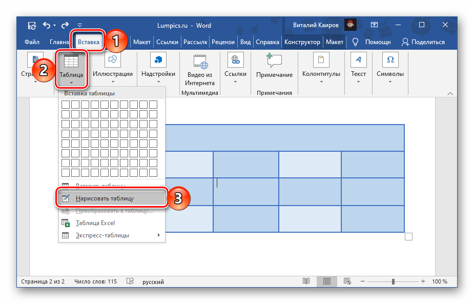- Перейдите во вкладку «Вставка», нажмите на кнопку «Таблица» и выберите пункт «Нарисовать таблицу».