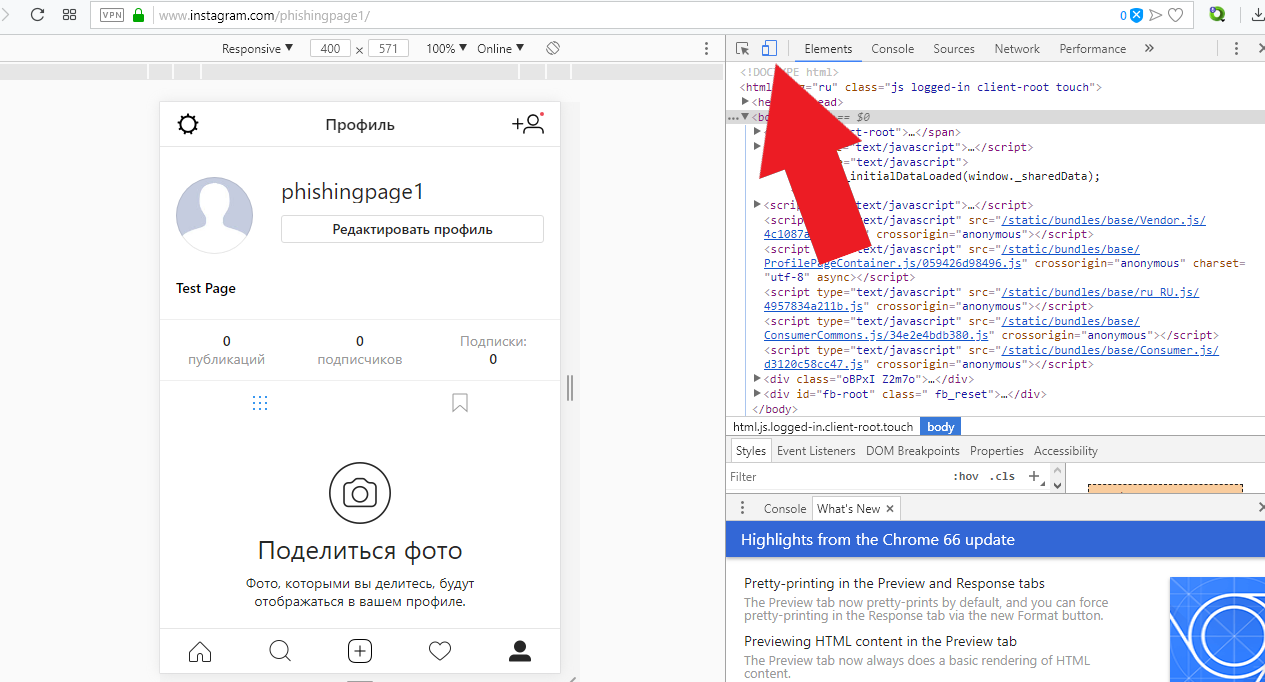- Нажимают на значок смартфона, расположенный на панели инструментов. При правильном выполнении действий сайт примет вид мобильной версии. Появится кнопка добавления публикаций.