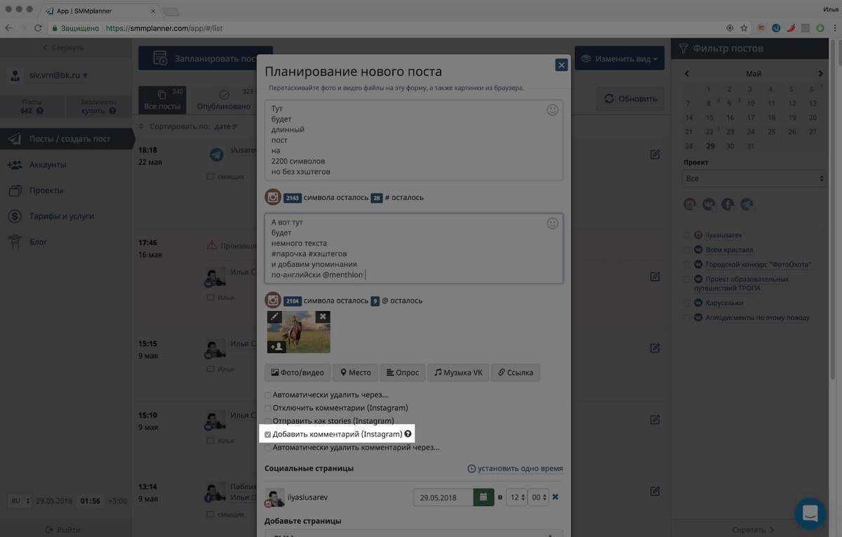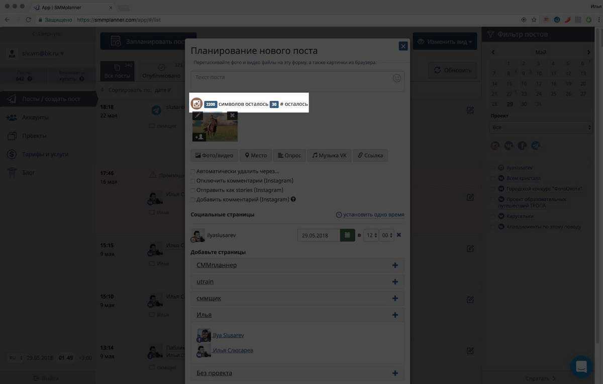 Напишите или вставьте текст в окно «текст поста», хэштеги, если вы ими пользуетесь. После выбора аккаунта Инстаграм у вас появится счетчик символов и хэштегов.
