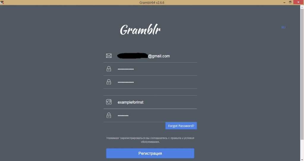 Третий популярный софт – это Gramblr. Чтобы начать им пользоваться, нужно ввести имя пользователя и пароль от своей страницы в инсте. Программа была разработана исключительно для того, чтобы загружать изображения и писать текстовые сопровождения к ним.