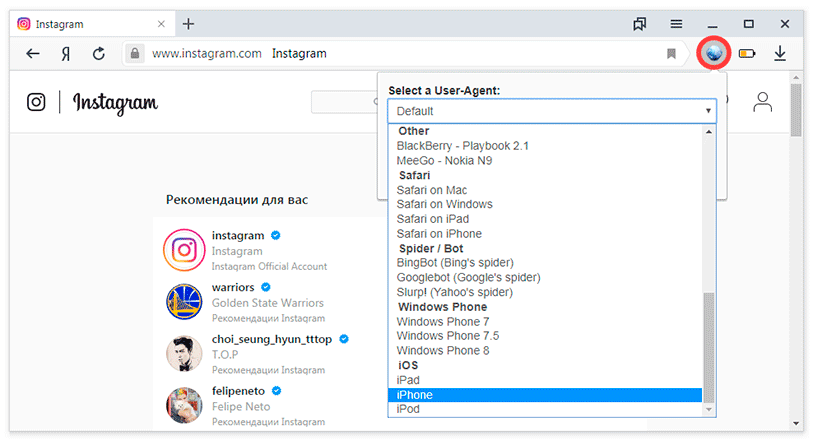 Если вы человек оригинальный и пользуетесь браузером Mozilla, то не сомневайтесь, о вас я тоже позаботилась и нашла способ эмулировать мобильную версию Instagram, чтобы загрузить фото с компьютера.