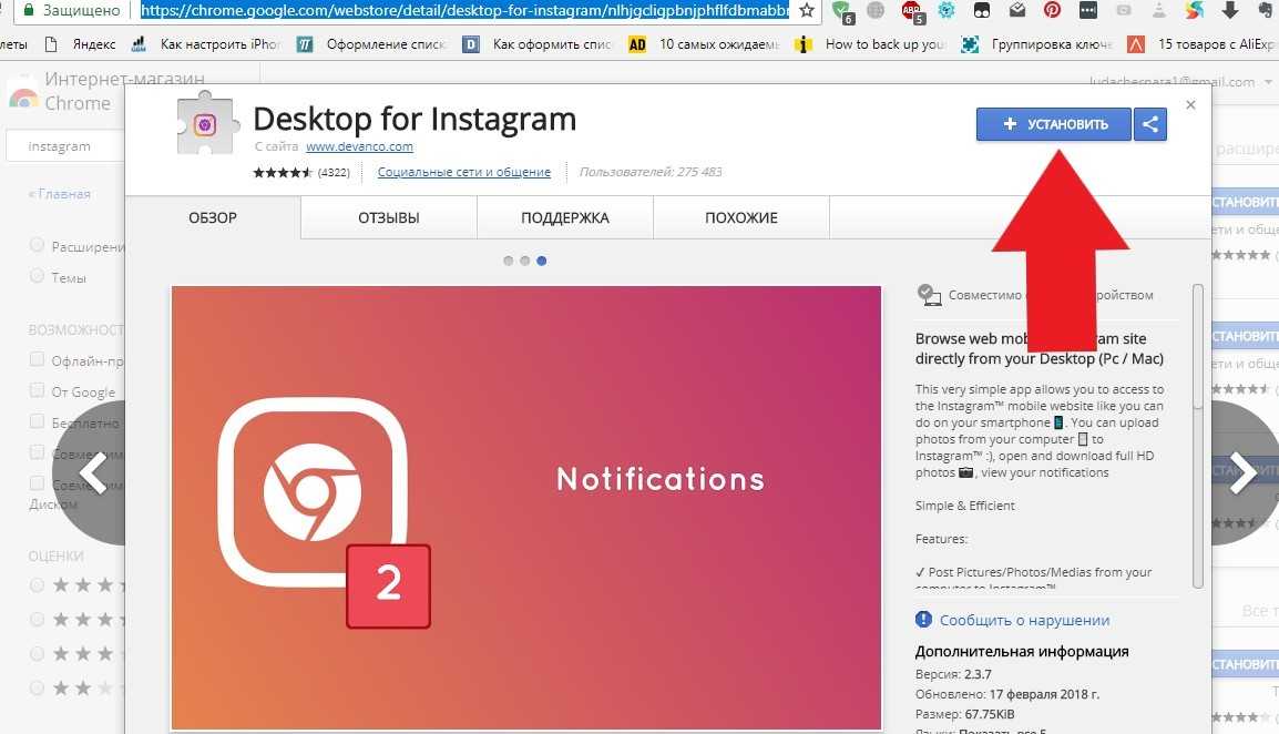 В этом случае перед тем как добавить публикацию в «Инстаграм» с компьютера, устанавливают специальное расширение. В качестве примера предлагаю изучить плагин Desktop for Instagram, который совместим с Google Chrome. Надстройки находятся в каталоге дополнений для браузера. Нажимают клавишу «Установить» рядом с названием плагина.