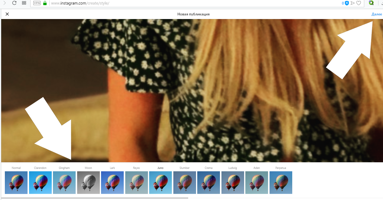 Нажмите на вкладку «Фильтр», чтобы добавить понравившийся эффект и на «Редактировать», если нужно обрезать/повернуть снимок. В правом верхнем углу кликните на «Далее»: