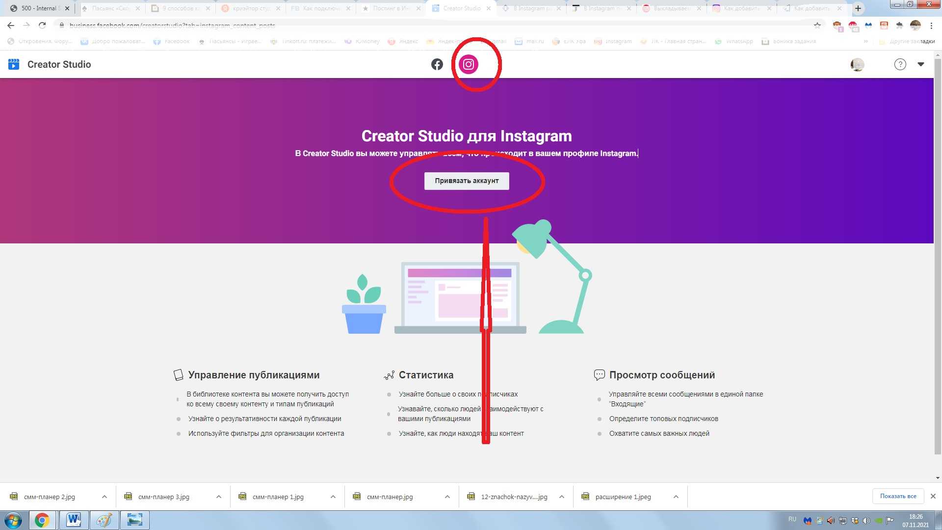 После входа в Creator Studio и создания Страницы, привяжите аккаунт Инстаграма* к странице Фейсбука*, нажав на значок Инстаграма*