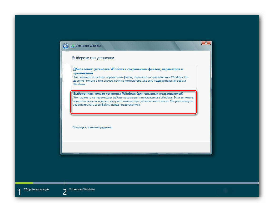 - После начала инсталляции ОС выбираем параметр «Полная установка» или «Выборочная установка» в зависимости от версии Windows.