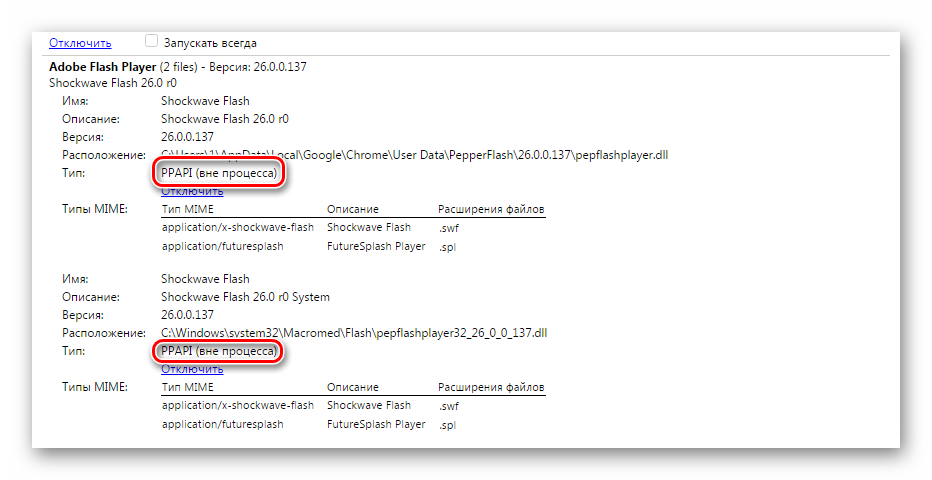 - Перейдите на страницу chrome://plugins, проверьте, что PPAPI Flash Player включен. Включите, если выключен.