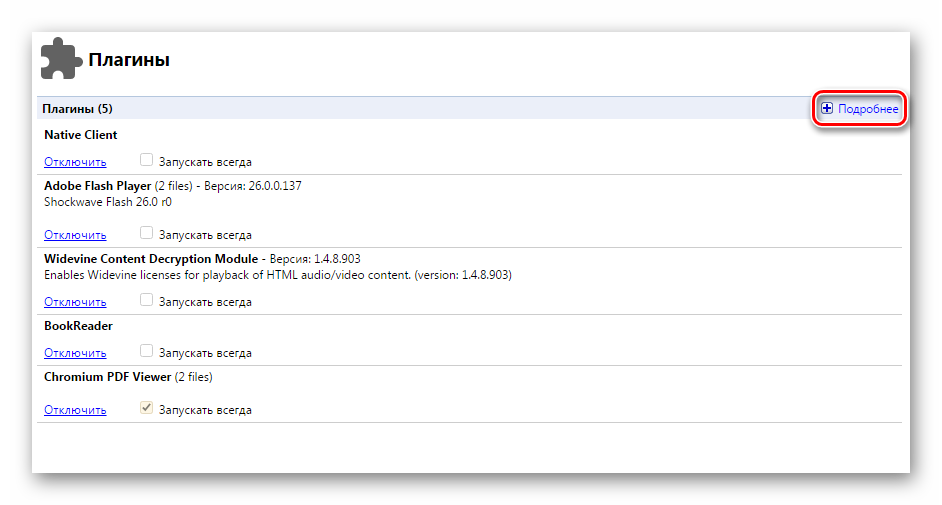 В этом интернет обозревателе установлено всего пять плагинов, больше, к сожалению, вы установить не можете, вам доступна только установка дополнений. Поэтому мы и будем разбираться только с проблемами данных модулей. А поскольку чаще всего случаются неполадки с Adobe Flash Player, то и разберем решения на примере него. Если же у вас проблемы с другими плагинами, то описанные ниже манипуляции вам тоже помогут.