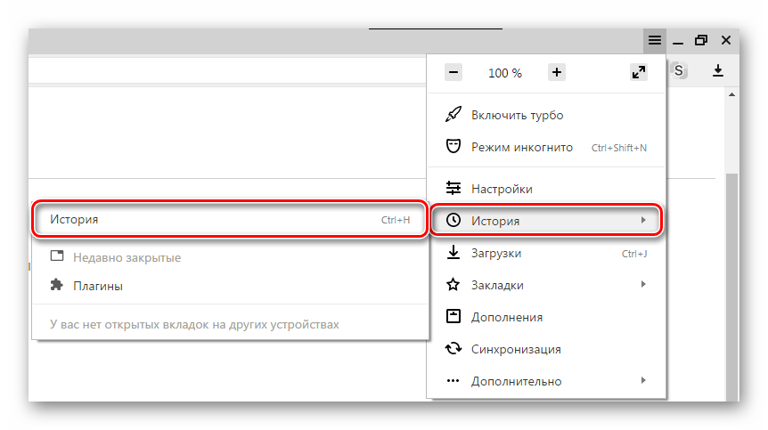 - Нажмите на значок в виде трех горизонтальных полос в правой верхней части браузера и раскройте «История», после чего перейдите в меню редактирования, нажав на «История».