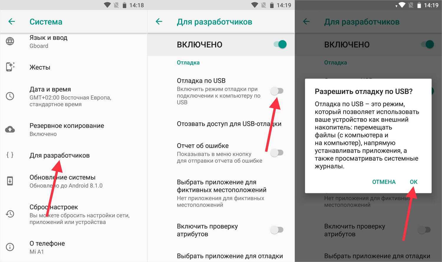 После выполненных действий пункт «Для разработчиков» появится в меню настроек («Настройки» → «Система» на Android 8 Oreo, 9 Pie, 10 и 11). Перейдите в раздел «Для разработчиков», активируйте пункт «Отладка по USB» и подтвердите, выбрав «ОК».