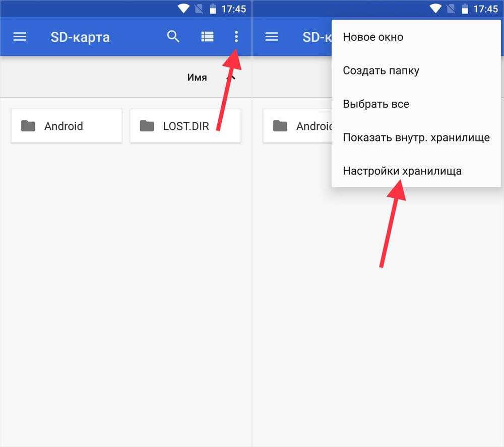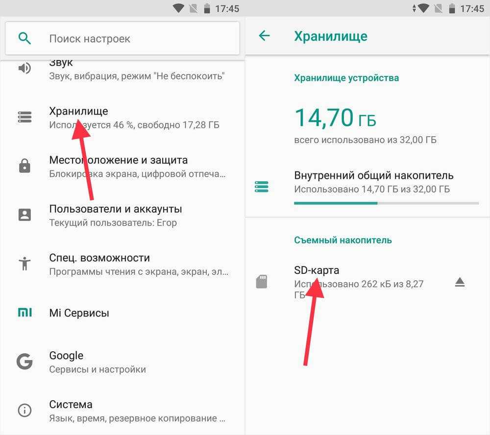 - Откройте раздел «Хранилище». Карта должна быть установлена в телефон.