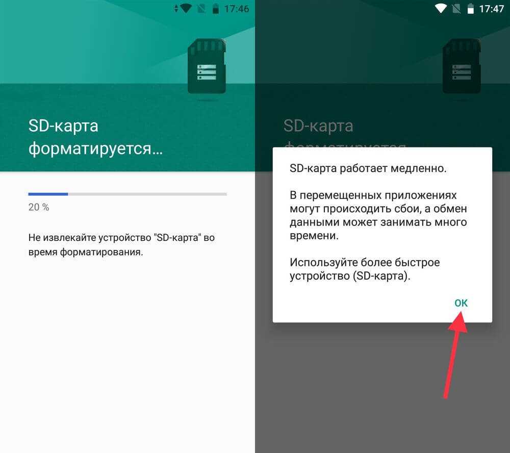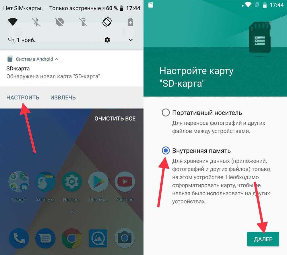 После подключения карты памяти, в области уведомлений появится оповещение об обнаружении новой SD карты. Нажмите «Настроить» и отформатируйте ее как внутреннюю память, следуя указаниям. Сохраненные на SD карте файлы будут удалены, так что заранее позаботьтесь о создании резервной копии.