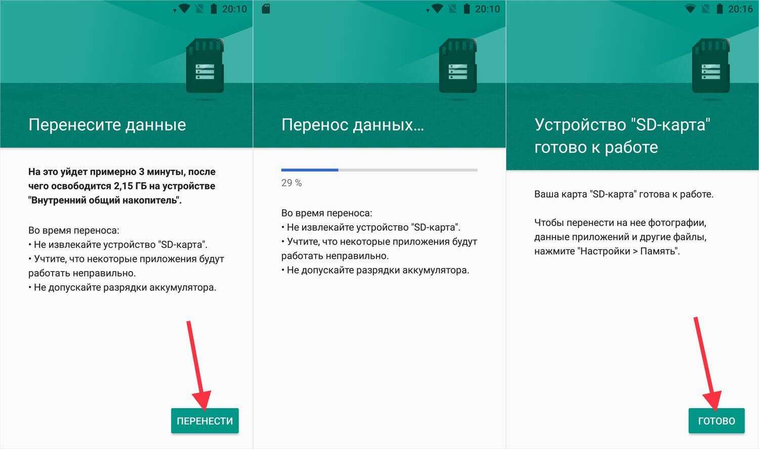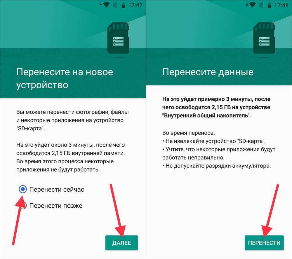 Далее будет предложено перенести некоторые приложения, фотографии и файлы на отформатированную карту. Выберите «Перенести сейчас», нажмите «Далее», а в следующем окне щелкните на «Перенести».