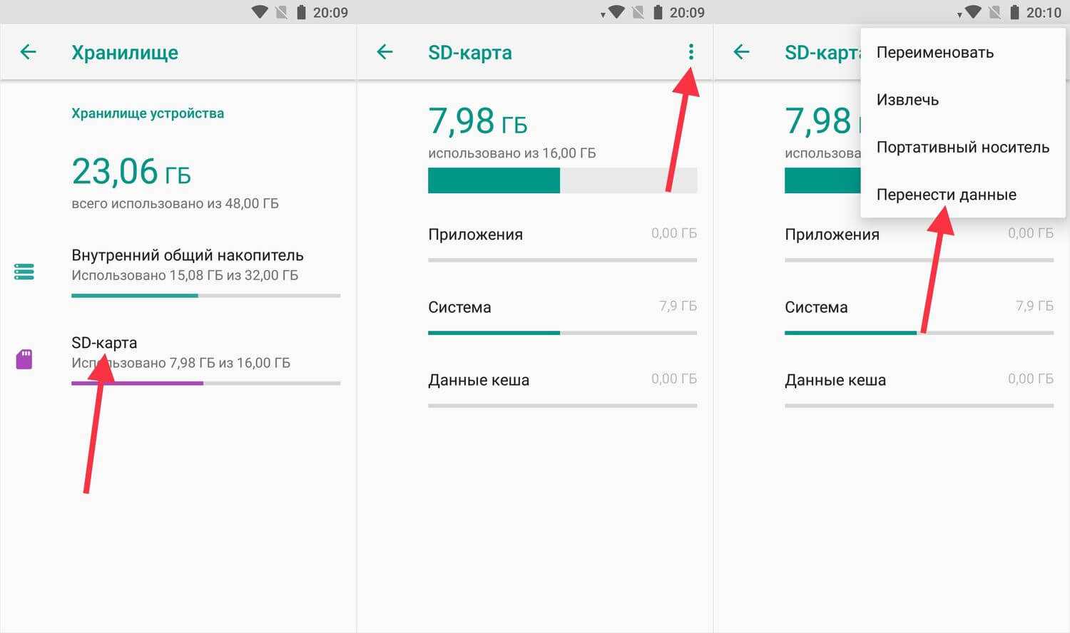Теперь зайдите в «Хранилище», выберите карту памяти, откройте ее настройки и щелкните «Перенести данные».