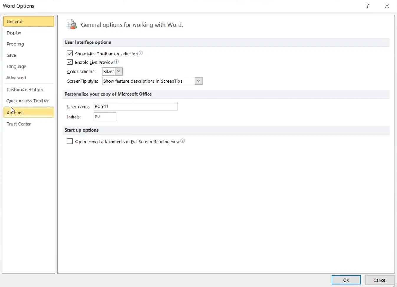 - Затем нажмите «Параметры» на вкладке «Файл», чтобы открыть это окно.