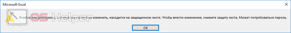 Выбранная ячейка будет неактивной и редактирование будет невозможно. При этом появится вот такая ошибка.