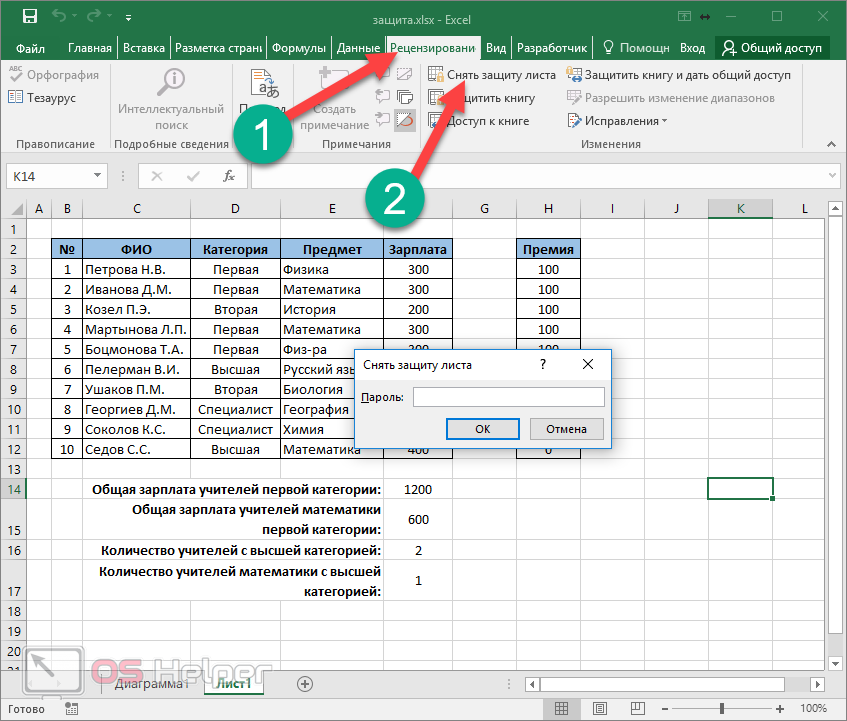 - Перейдите на вкладку «Рецензирование» и нажмите на кнопку «Снять защиту листа».