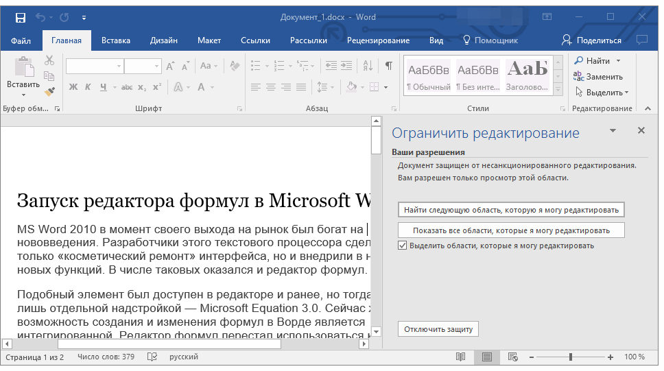 Повторимся, снятие защиты на редактирование возможно лишь в том случае, если документ, с которым вы работаете, не защищен паролем и не защищен сторонним пользователем, под его аккаунтом. Если же речь идет о случаях, когда на файл или на возможность его редактирования установлен пароль, не зная его, внести изменения, а то и вовсе не сможете открыть текстовый документ невозможно.