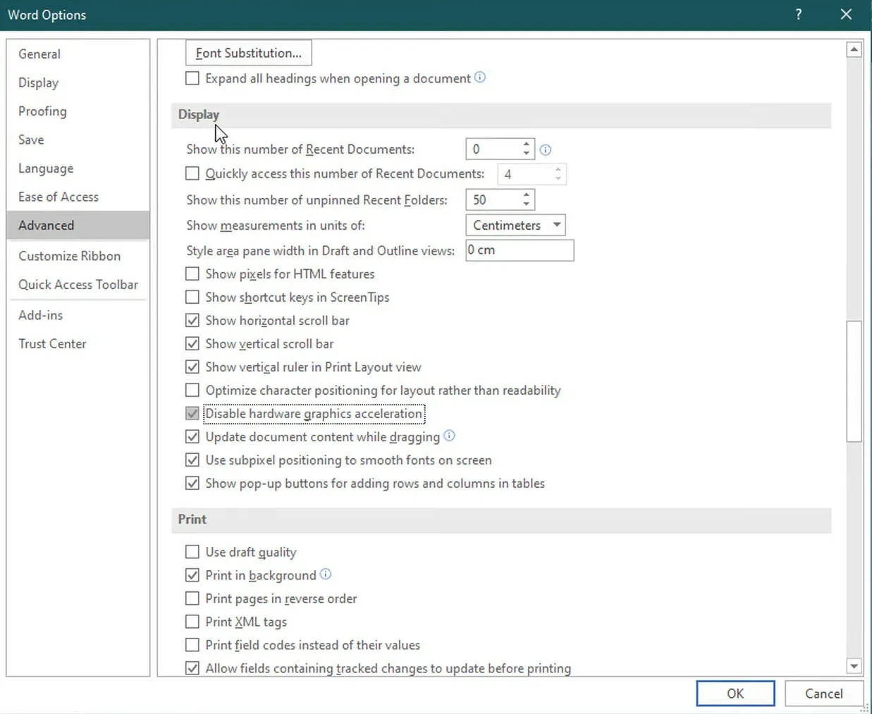 - Установите флажок для параметра Отключить аппаратное ускорение графики.
