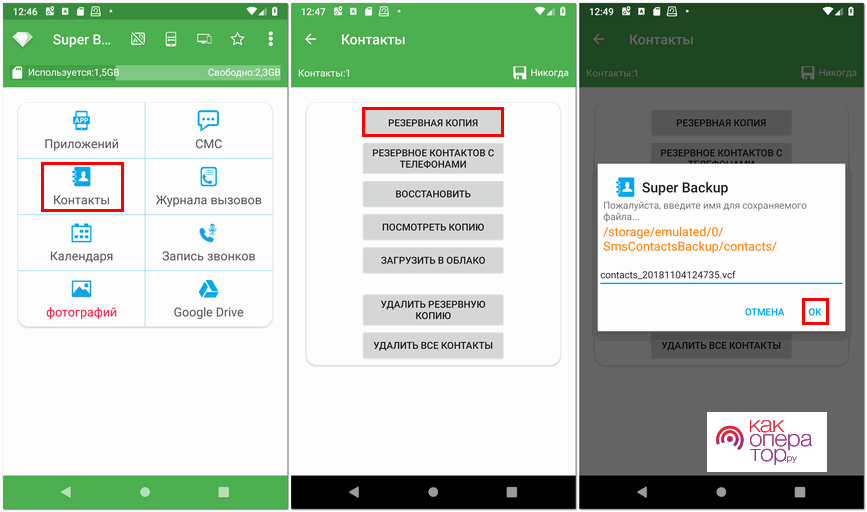 Использование мобильного приложения Easy Contacts Backup & Restore