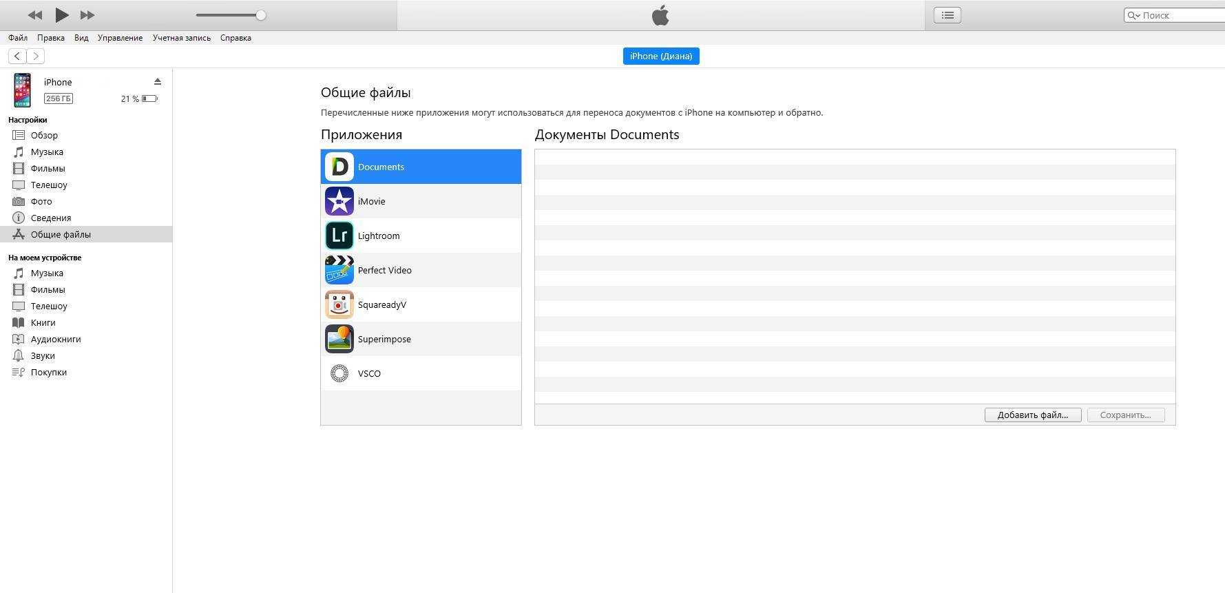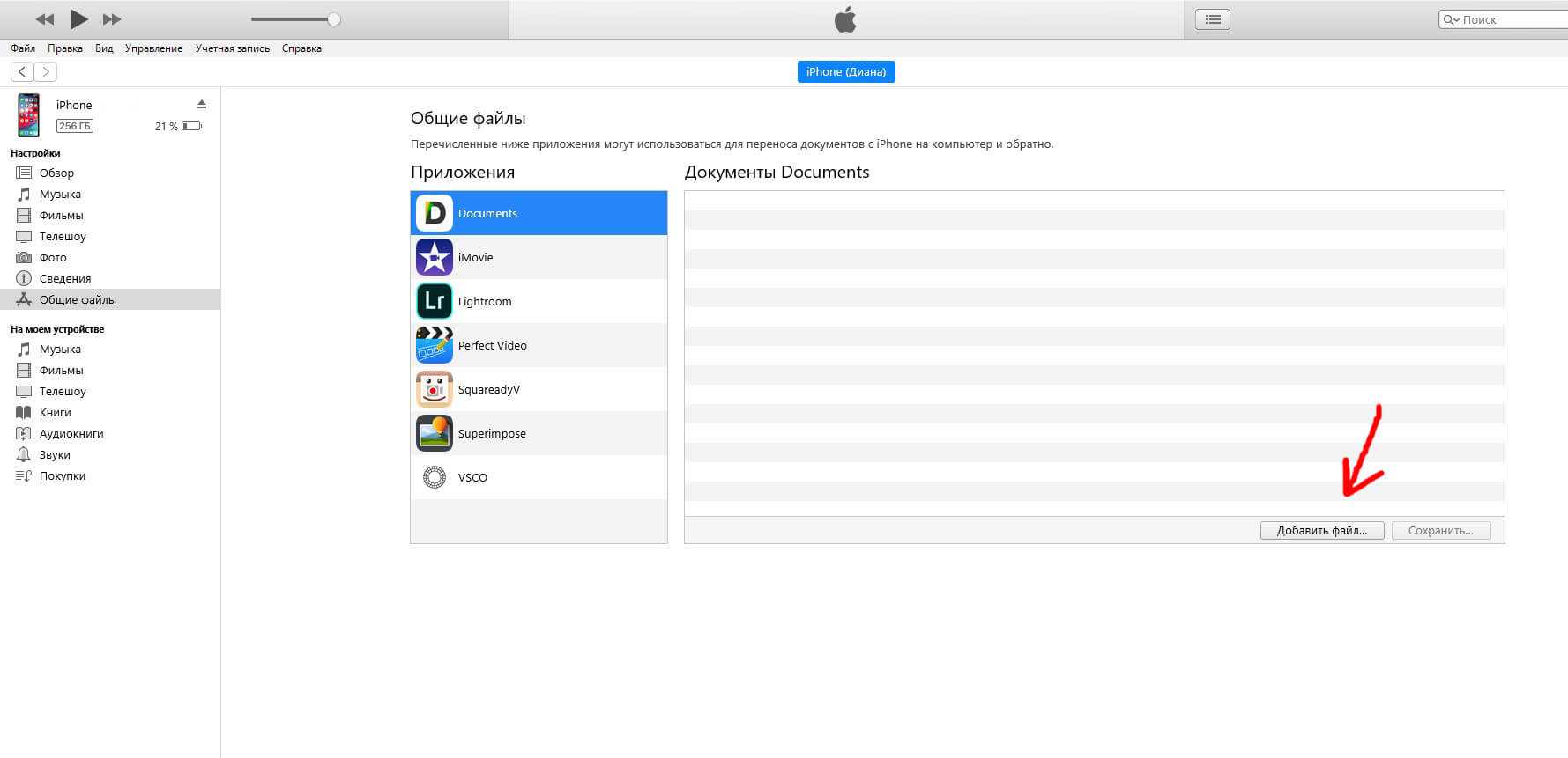В левой части iTunes откроется меню подключенного устройства, выберите в нем раздел «Общие файлы» (в старых версиях iTunes нужно перейти в раздел Программы).