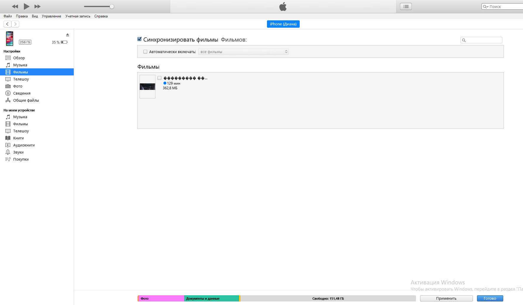 Останется лишь подключить iPhone или iPad к компьютеру, выбрать его в iTunes, отметить галочкой нужный контент в разделе «Фильмы» и нажать «Применить», а затем «Синхронизировать».