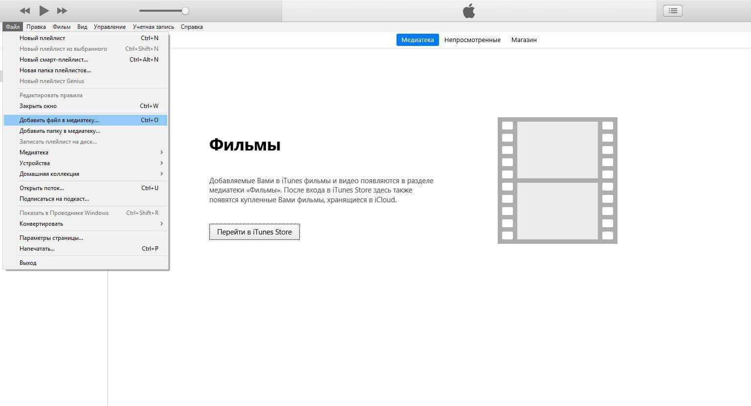 Для загрузки готового ролика в iTunes следует выбрать пункт «Добавить в медиатеку…» в меню Файл